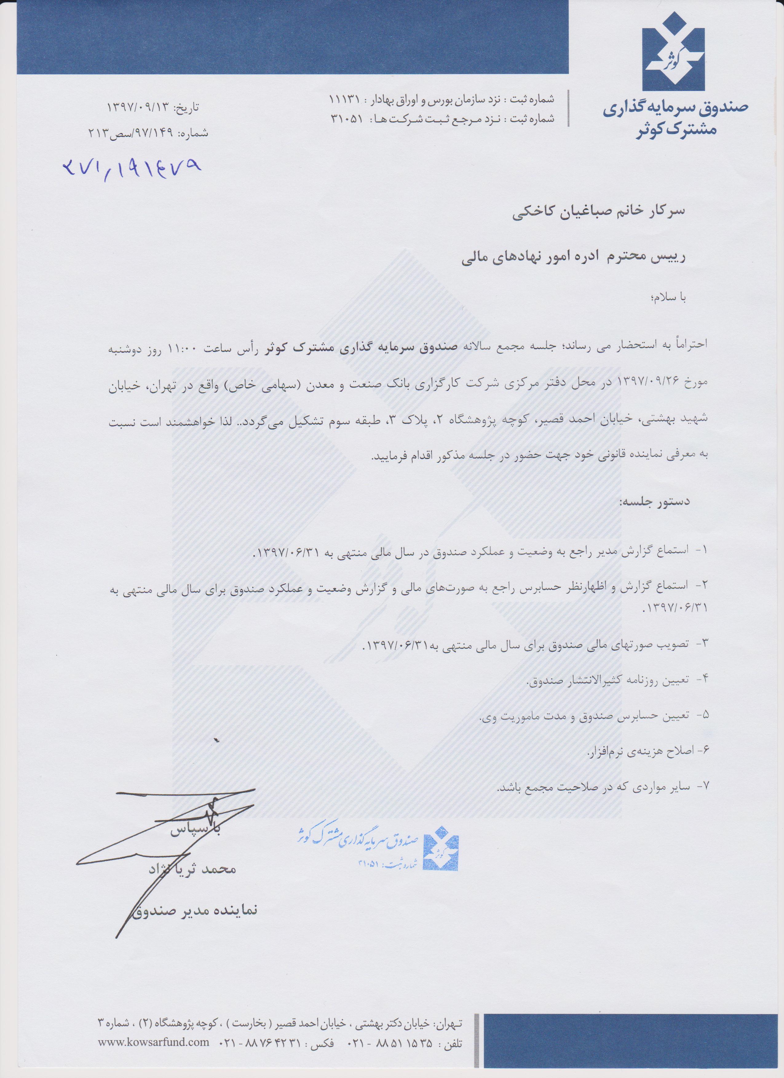 دعوتنامه حضور در مجمع مورخ1397/11/03 صندوق مشترک کوثر