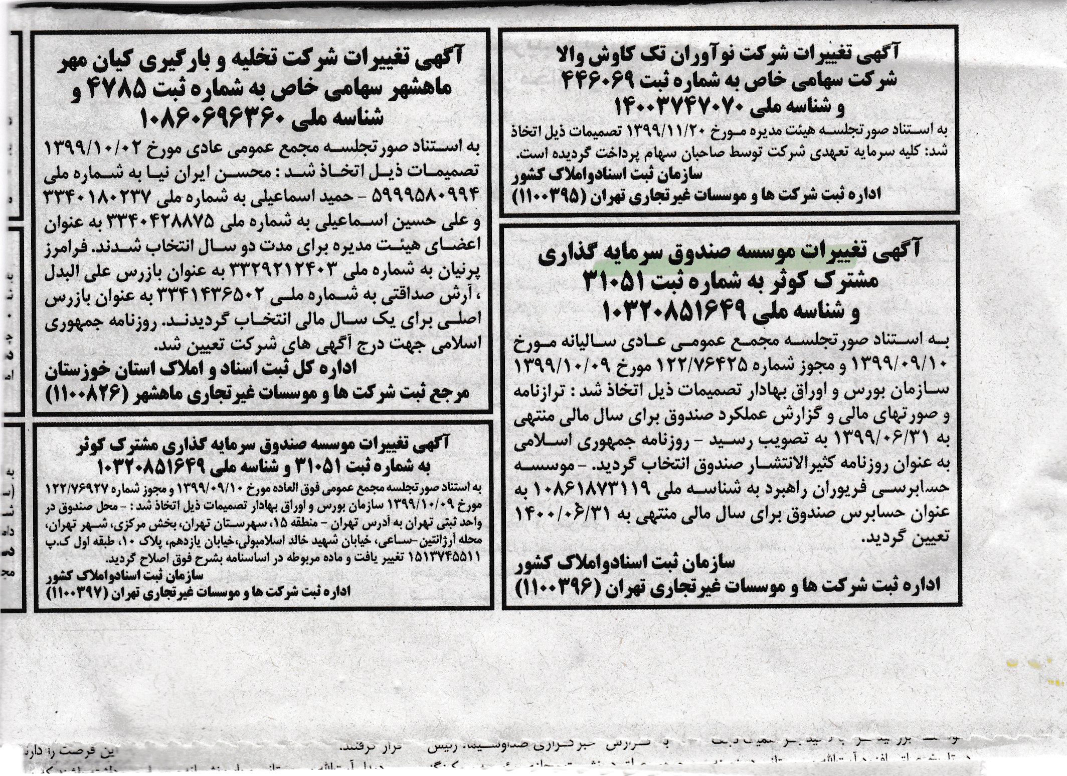 آگهی تغییرات شرکت صندوق سرمایه گذاری کوثر به شماره ثبت ۳۱۰۵۱ و شناسه ملی ۱۰۳۲۰۸۵۱۶۴۹